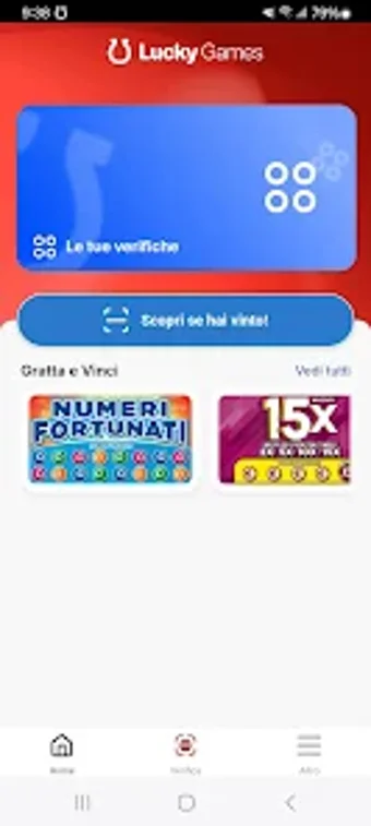 Lucky Verifica Vincite è un'applicazione gratuita disponibile su Android, progettata per aiutare gli utenti a verificare le vincite di diverse lotterie. L'app consente di controllare rapidamente i risultati delle giocate tramite la scansione del QR Code sulla ricevuta o inserendo manualmente i dati del biglietto. La schermata principale offre un accesso facile a tutte le funzionalità, inclusa la consultazione delle verifiche recenti e dei giochi supportati.